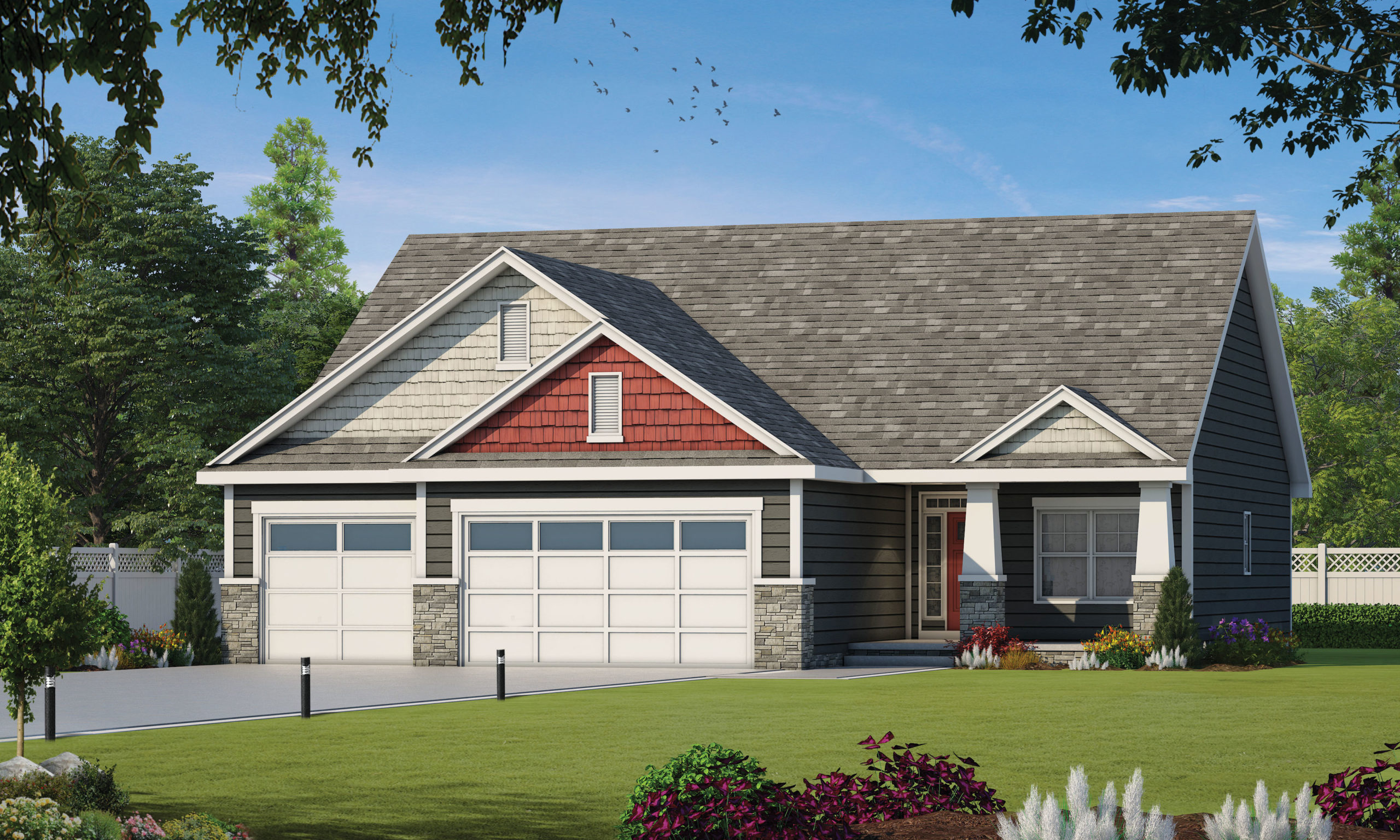 Contrasting colors of shake shingle siding are one of the eye-catching elements of the Jensen Falls. Another is the covered front porch established by tapered columns set atop stone bases – adding to the home’s obvious Craftsman–influenced styling. A sidelite and transom window over the front door further contribute to this home’s sense of “Welcome!” At just 50-feet wide including its 3-car garage, split bedroom layout and open floorplan, The Jensen Falls accommodates so many buyer preferences!