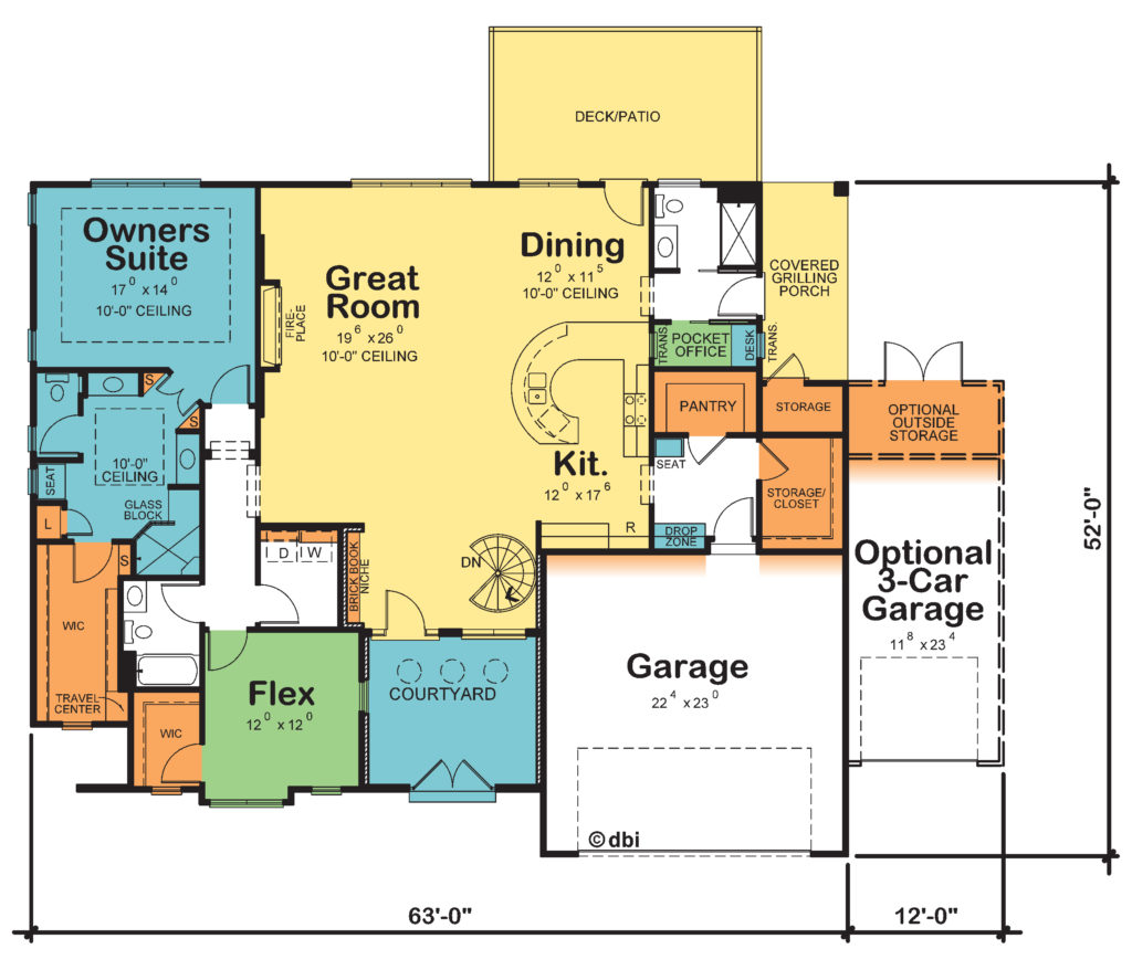 The Gunnison (plan #50016) offers doors onto its loggia from both the dining room and the great room, providing a circular traffic route with minimal congestion. Notice also, being framed by the dining room and owner’s suite, this particular layout offers maximum privacy from side-neighbors for your get-together. And there is a door off the owner’s bedroom, perfect for enjoying quiet sunsets and cheery mornings.